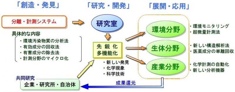私たちの研究室では,環境や生体中に存在する超微量成分を分析するための高性能な分析システムを開発しています。環境・生命・産業などの様々な分野で社会に役立つ分析技術を創ることが目的です。つまり,私たちは,これまで “分析方法がなかった”,“時間がかかりすぎて困っている”,“妨害成分があって分析できない”,“特殊なスキルが必要で誰も分析できない” などなど,分析することが難しいと言われている事象に対して,いかに簡単に分析するかを考える 『分析手法を創る研究室』です。