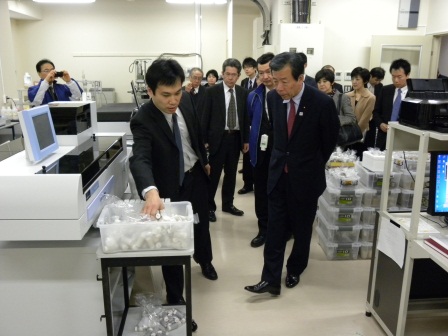 4月8日(日) 平野文部科学大臣ならびに文部科学省の皆さまが,福島大学における放射線分析,核種分析の現状を視察にお見えになりました。セシウム分析やストロンチウム分析などの状況,土壌やコメ,ウシなどの試料のことを説明いたしました。