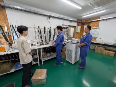 見学前,化研さんの業務は放射能分析だけだと思っていました。しかし,実際に見学させていただくとアスベストや土壌分析等の幅広い分析業務をしているとのことです。その分析サービスを提供するために化研さんでは,市販の分析装置を購入するだけでなく自社で前処理装置・分析装置を製作し新たな分析法を開発するようです。私も従来の装置や手法に頼るだけではなく,創意工夫で良い分析法を生み出したいと感じました。