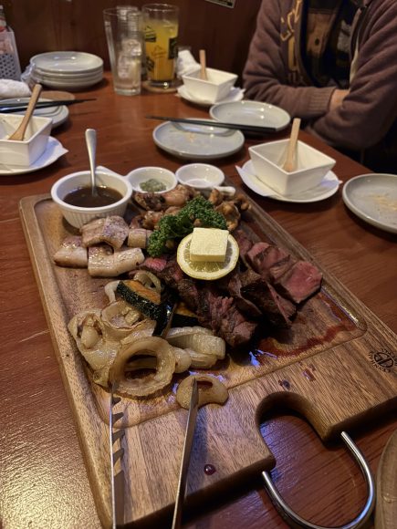 豪華なステーキをごちそうになりながら,川上さんのサウナ話やNW先輩のエピソードなど,楽しい時間を過ごしました!