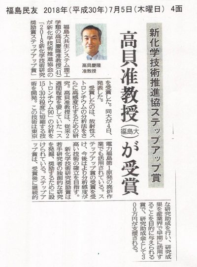 高貝先生が、日本分析化学会東北支部が主催する「東北分析化学賞」を受賞 しました。 「東北分析化学賞」は、分析化学の進歩に寄与する優れた業績をあげた者に対して授与される賞で、高貝先生の研究業績「濃縮分離法の構築による微量成 … 続きを読む