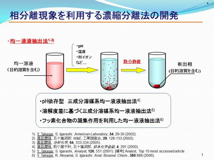 これまでの研究成果『カスケード型濃縮分離法』が『分析化学』誌の総合論文に掲載が決まりました。 詳細は後ほど 高貝慶隆,分析化学(総合論文),in press (2013). “カスケード型高倍率濃縮分離システムの構築と分 … 続きを読む